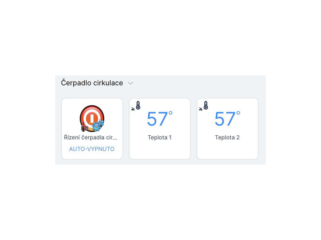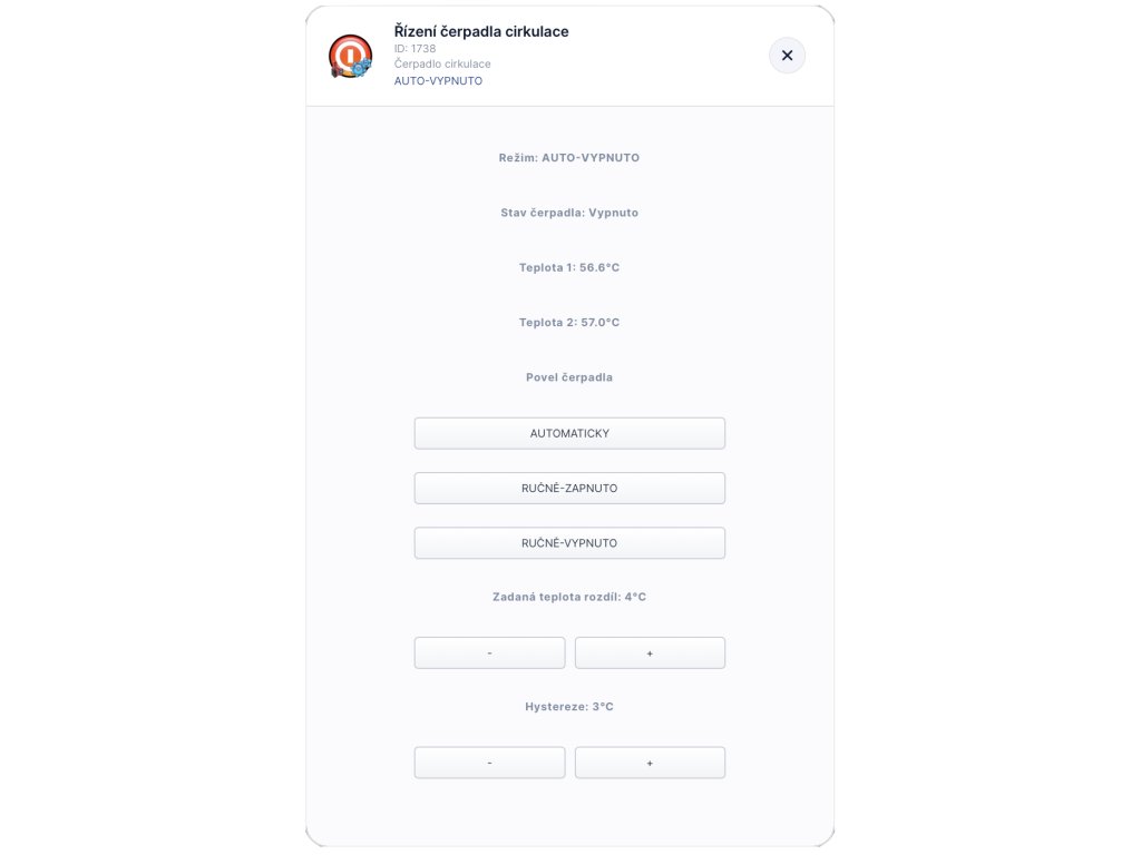 Aplikace čte měřené a zadané teploty místností z termostatů místností a dle porovnání pak řídí oběhové čerpadlo vytápění.