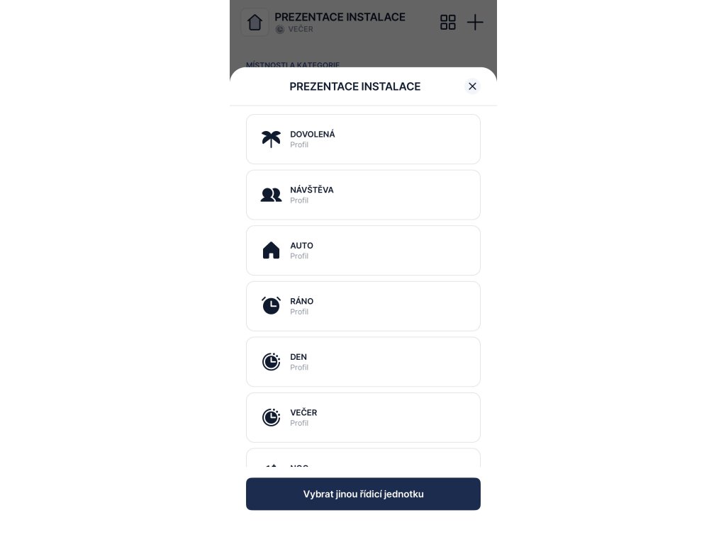 Automatická instalace profilů a jejich ovládání dle automatického nebo režimu zvoleného uživatelem. Uživatel zvolí režim dovolené, návštěny, atd. nebo je dle denní doby automaticky navolen režim ráno, den, večer a noc.