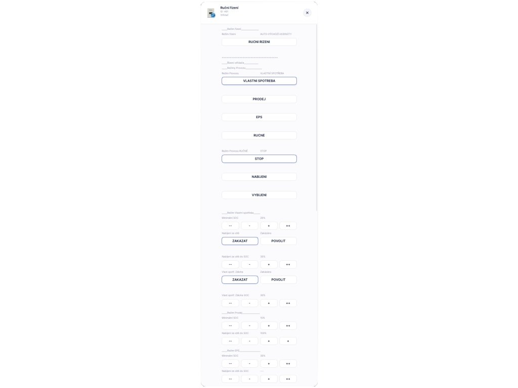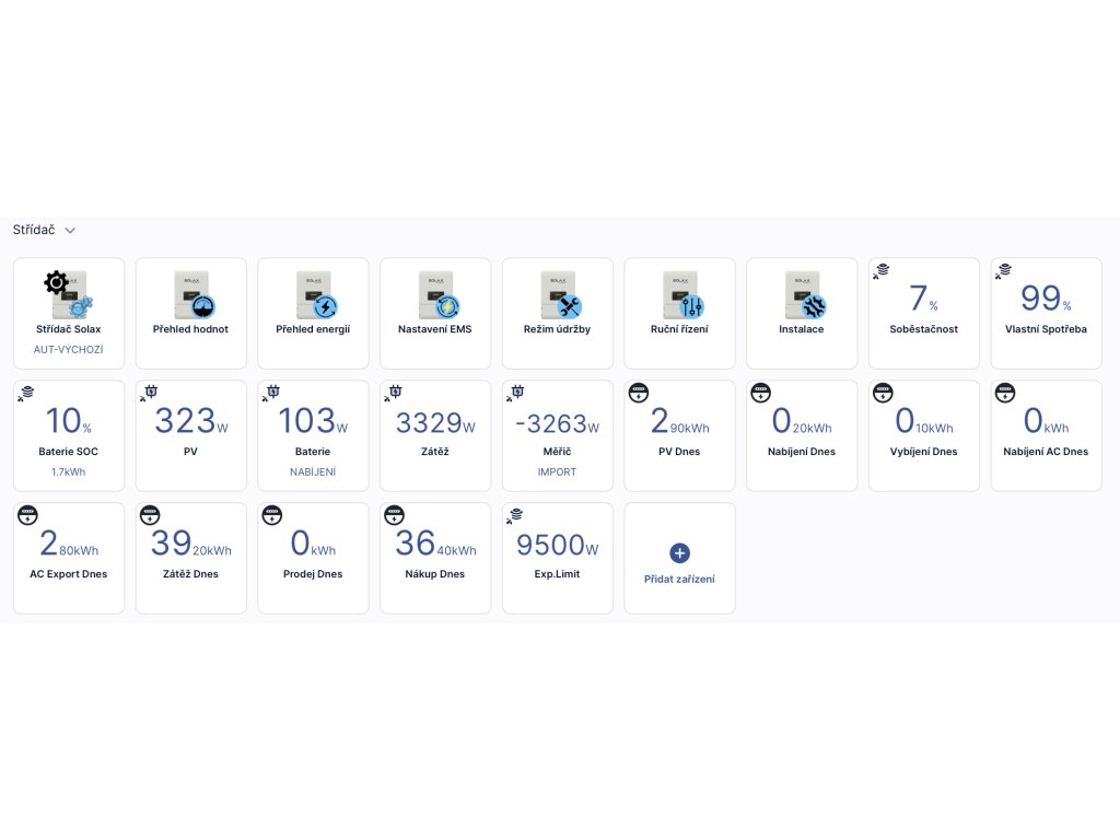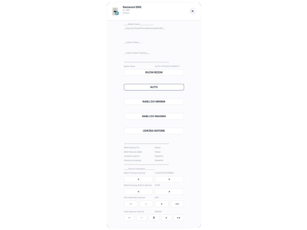Nabízí praktické funkce pro domácnosti i firmy – od vizualizace dat v reálném čase, přes ruční nastavení, až po napojení na pokročilé energetické strategie (např. SPOT, přítomnost, přetoky).