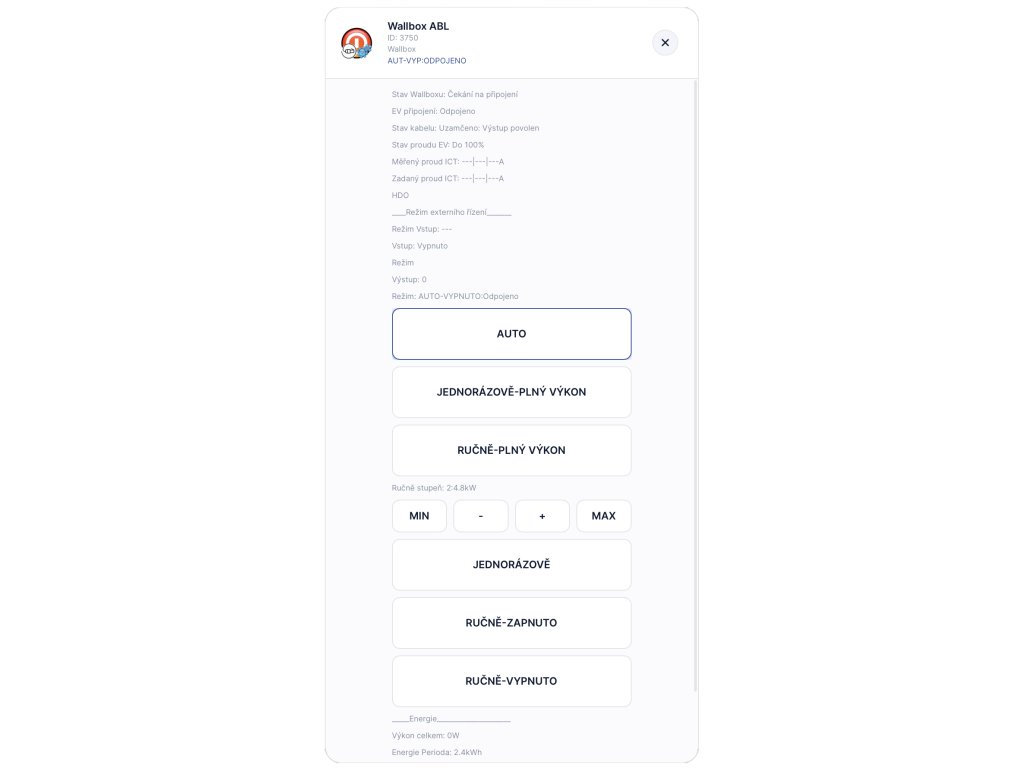 Čtení a ovládání wallboxu ABL . Umožňuje propojení s využitím přebytků FVE nebo s řízením wallboxu pro spotové řízení