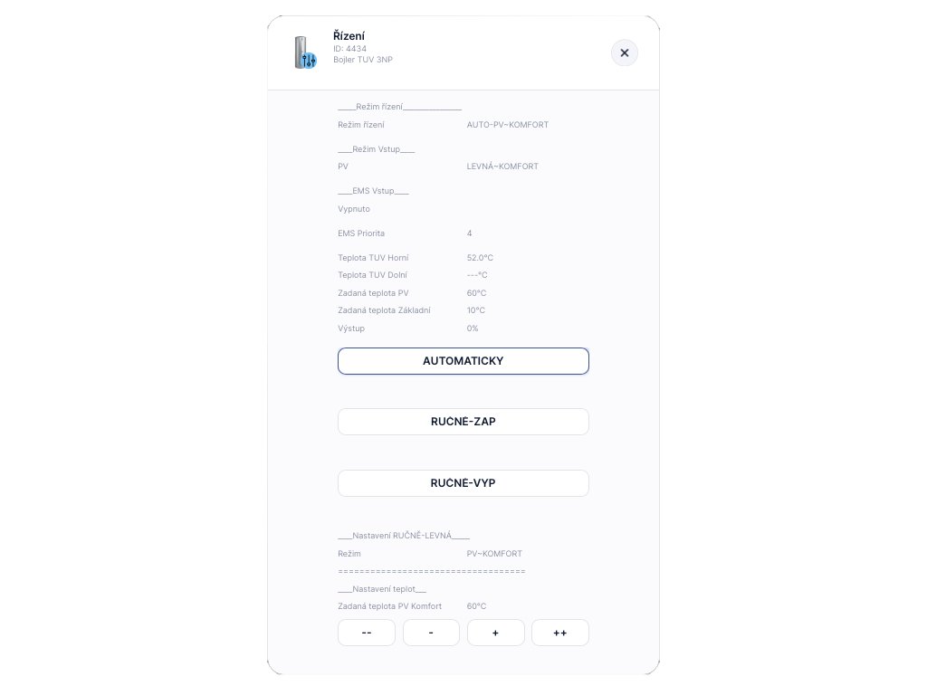 - Režimy: Ekonomický, Normální, Komfortní, Maximální, Jednorázový
