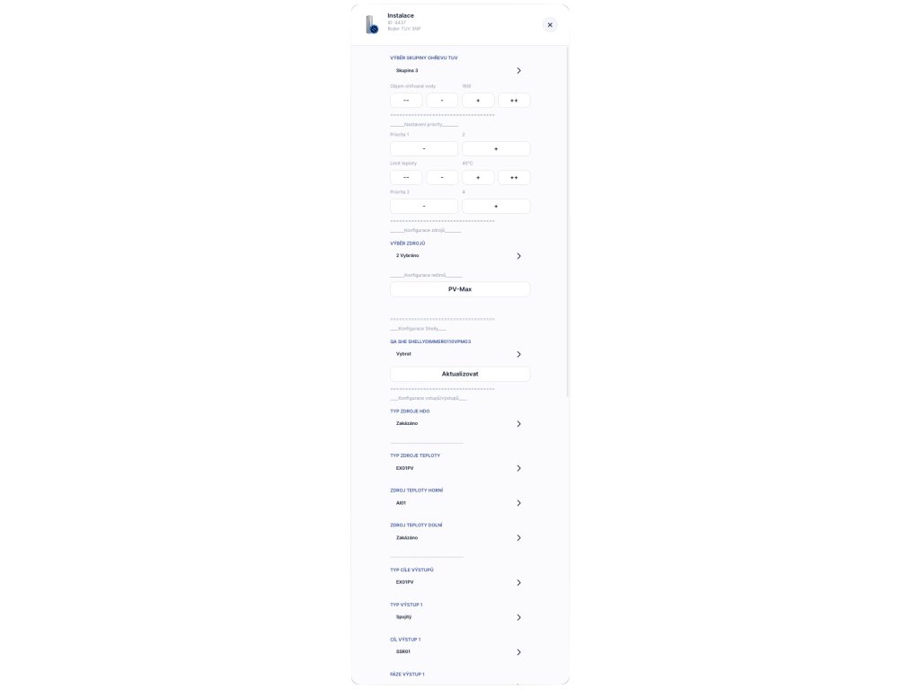 | Integrace: | Režim TUV, EMS, SPOT, EX01PV, Shelly Dimmer |