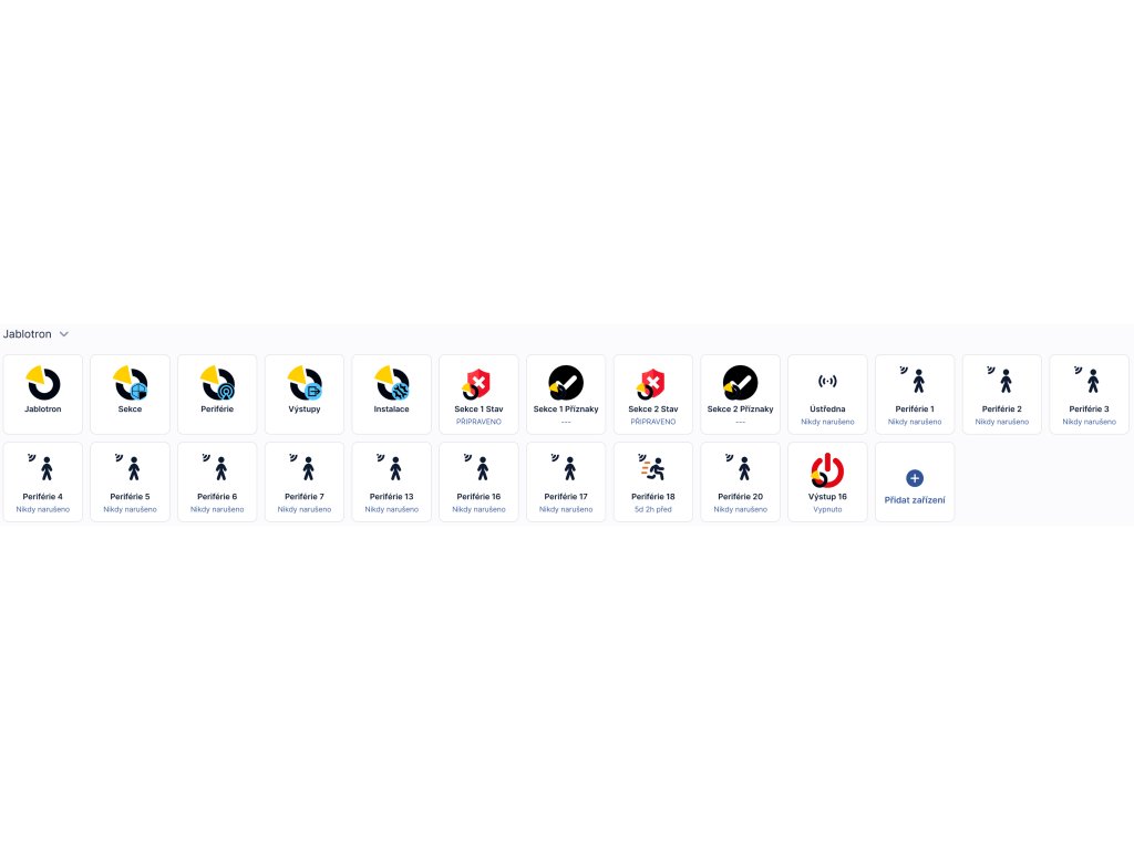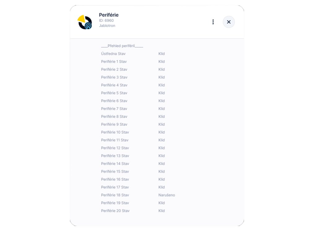 - ✅ Stavový přehled: Zobrazení stavu zastřežení, alarmových stavů a všech periférií v reálném čase.