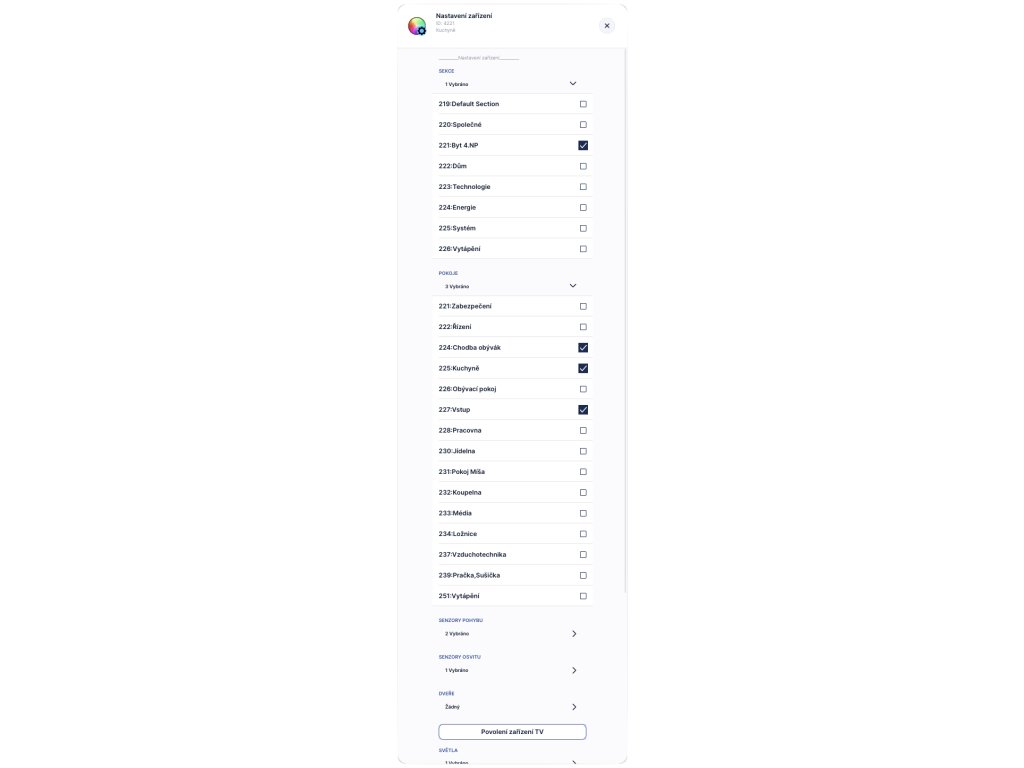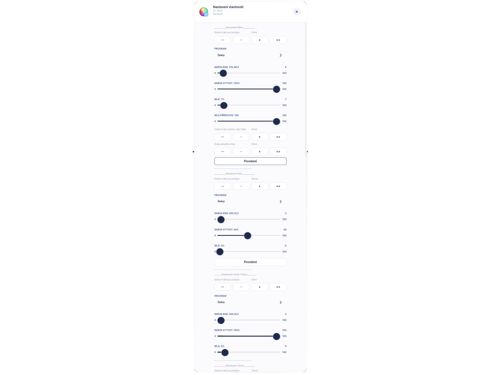 - Kaskádovitý výběr prvků: Sekce -> Pokoje -> Zařízení (RGBW/Dimmer)