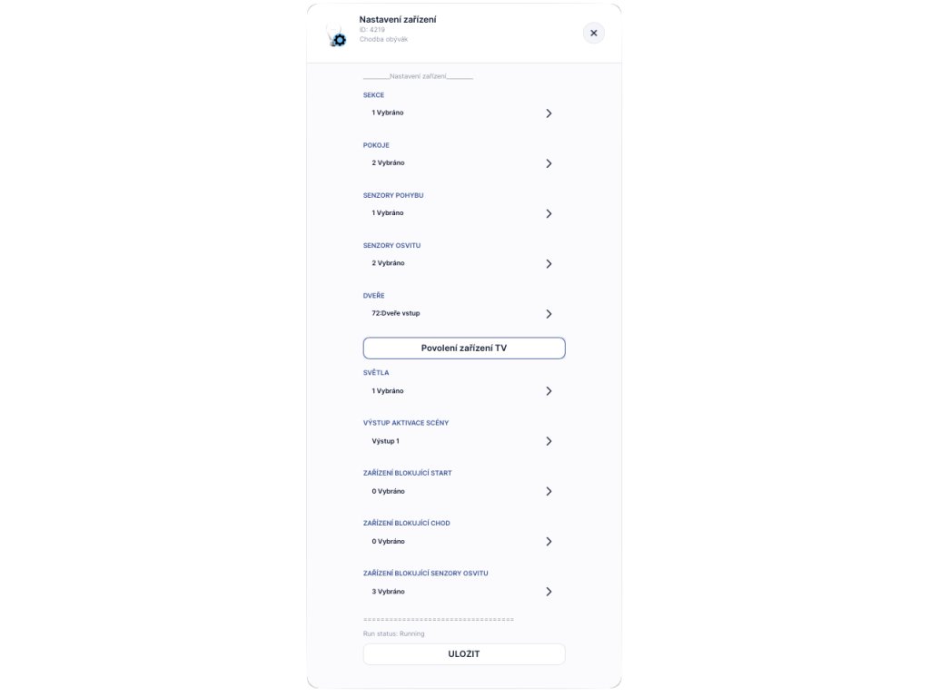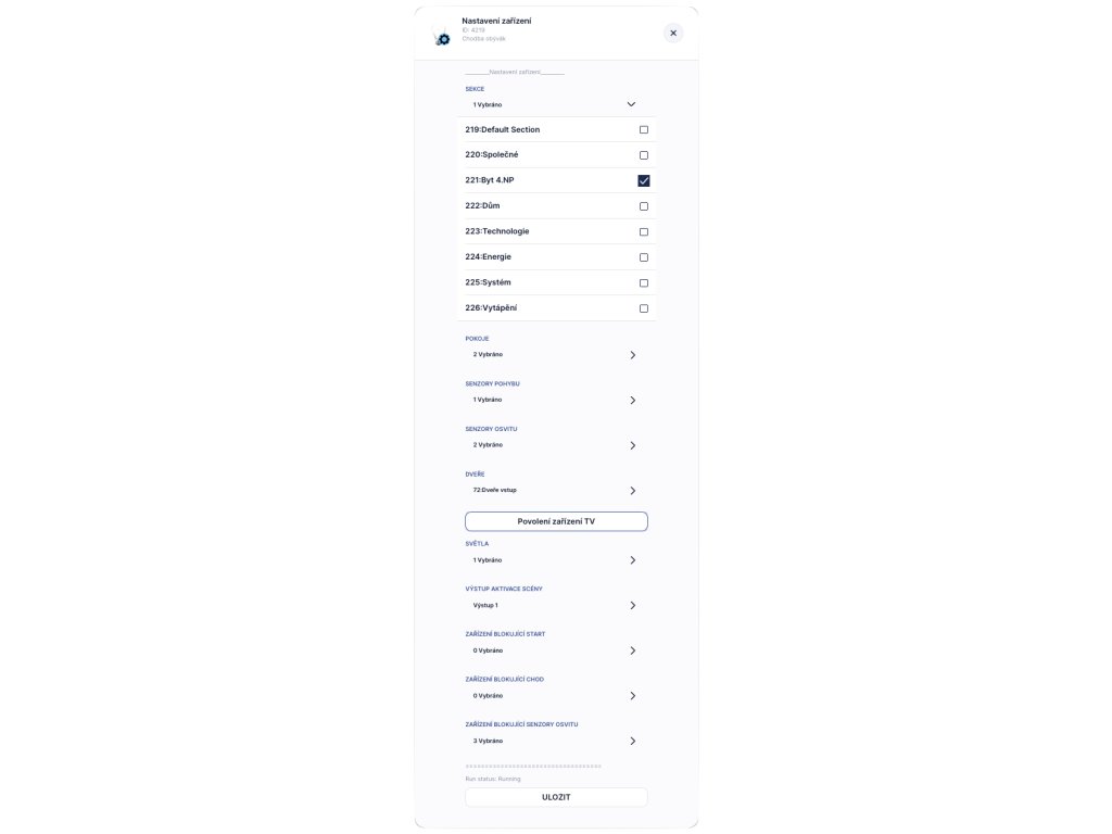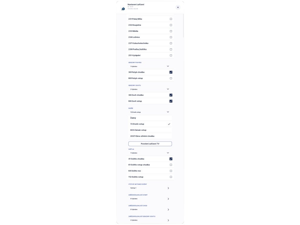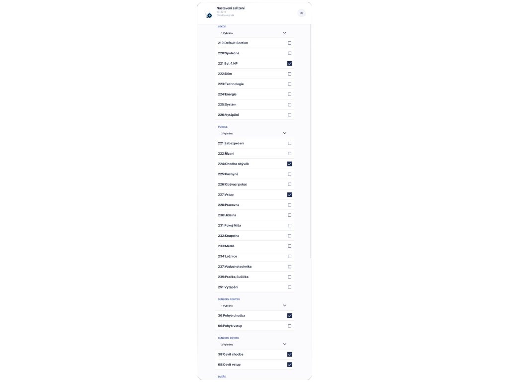 - Kaskádovitý výběr prvků: Sekce -> Pokoje -> Zařízení