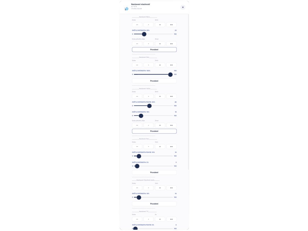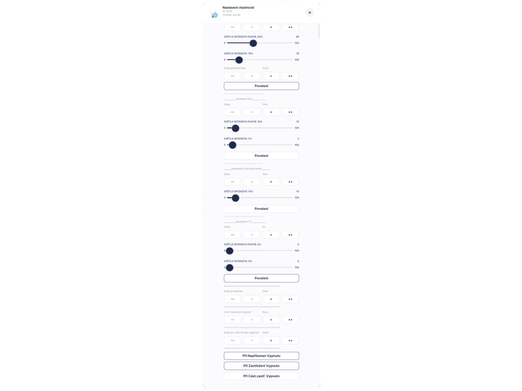 - Detailní konfigurace chování pro: Ráno, Den, Večer, Noc
